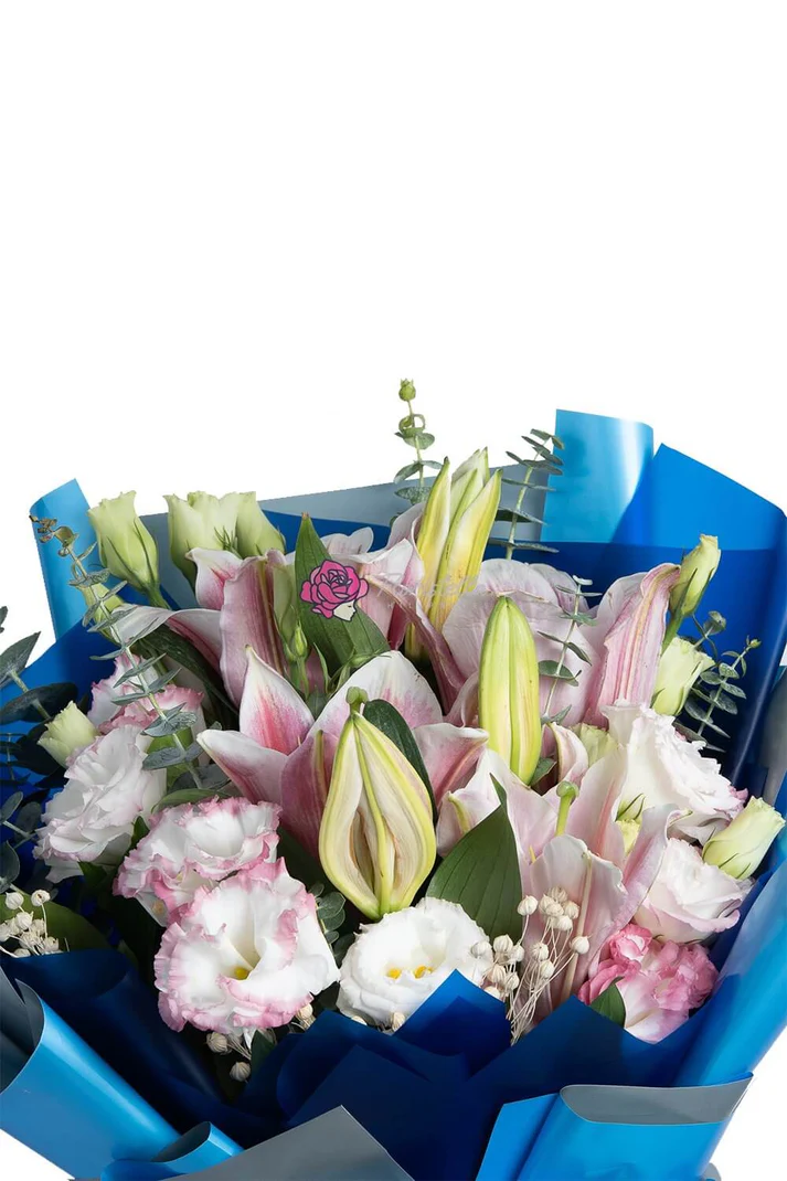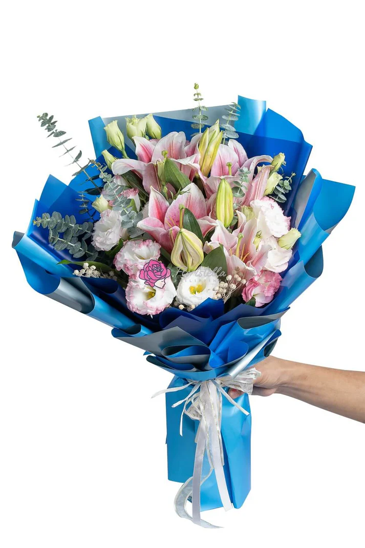 Bubble Gum is more than just a pretty arrangement. It’s a meaningful gift made to celebrate milestones both big and small. The pink lilies offer fragrance and femininity, while the lisianthus and carnations add texture and depth. Paired with eucalyptus and delicate fillers, the mix feels light yet full, simple yet luxurious. The bold blue wrapping gives it a stylish edge—perfect for someone who stands out.