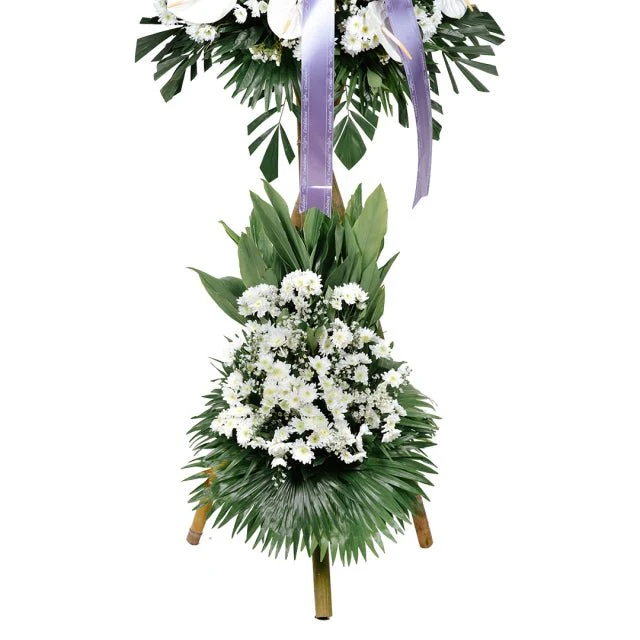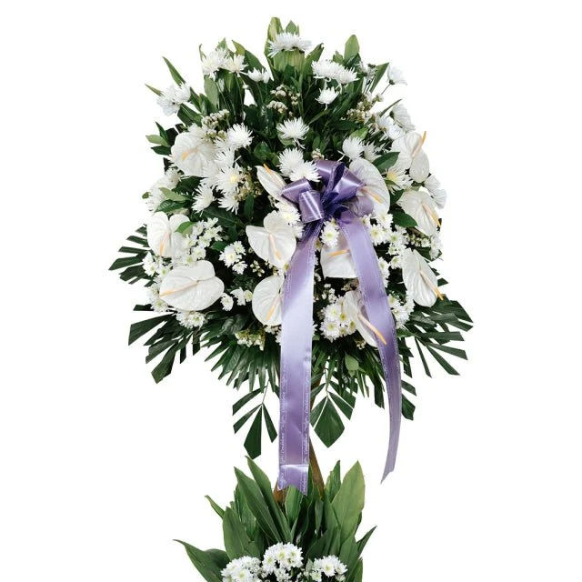 White Condolence Flower Stand: A serene arrangement of White Anthurium, Radus, and Aster with Fishtail Leaves. A dignified tribute symbolizing peace and remembrance.